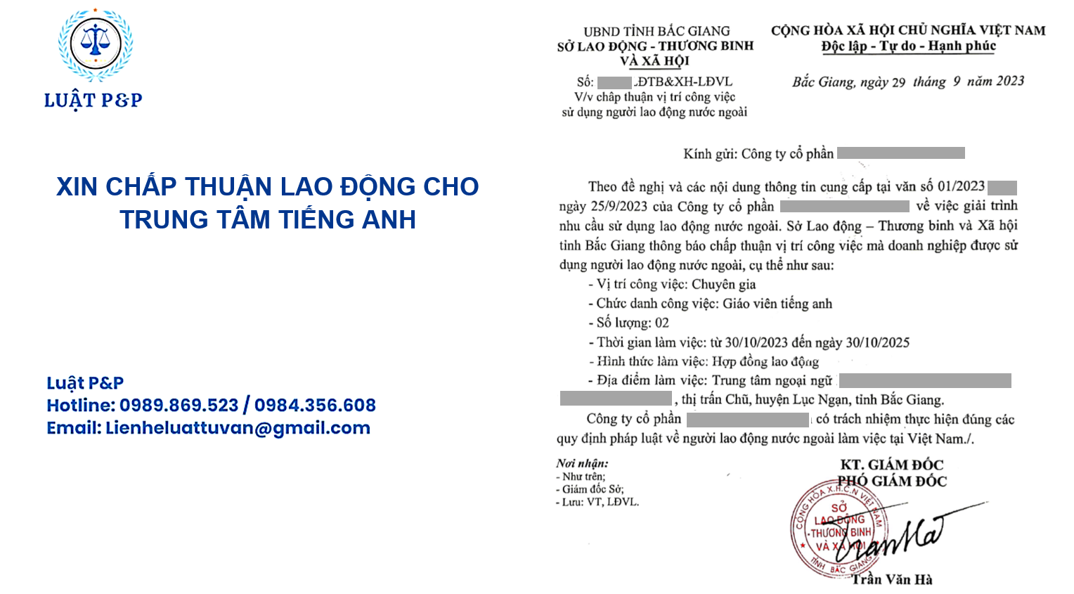 - Nhận kết quả và bàn giao bản gốc cho quý khách hàng sau khi thực hiện thủ tục xin chấp thuận lao động cho trung tâm tiếng Anh.